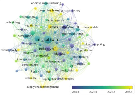 Figure 8 displays the trends and developments of the keywords in recent years. The lighter colors show the recent study areas of researchers in digital twin in the supply chain. They include deep learning, machine learning, data models, edge computing, artificial intelligence, and supply chain management. Nowadays, researchers are engaging in integrating digital twin with machine and deep learning. Fischer et al. [95] used the artificial neural network, which was a part of deep learning, for activity recognition, which was then used to perform discrete-event simulation. The digital twin technology and functional block has an application domain for data visualization and analytics, which is a part of machine learning [96]. The digital twin of an entity is also able to train deep learning algorithms [97]. There is also a potential research gap for the application of digital twin in a deep learning architecture for mobile edge computing. Moreover, Yang et al. [98] proposed a model with model reduction and deep neural network as a basic to develop digital twin for nuclear power system but noted that there was still a research gap to increase the efficiency of the model. Moreover, digital twin is also seen as a driver to speed up the realization of Industry 5.0 in the future [99].