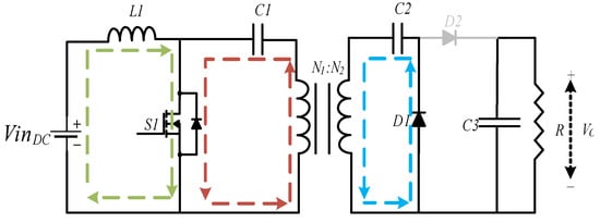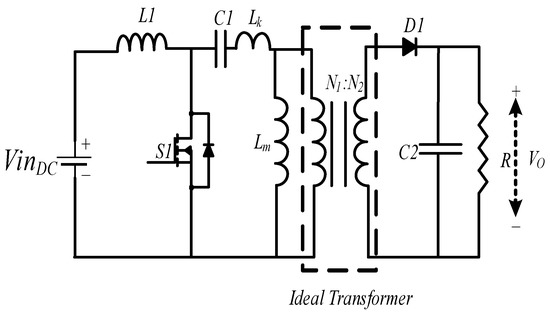 The conventional isolated single-ended-primary-inductance converter (SEPIC) is shown in Figure 1, and the voltage gain is given by Equation (1) as explained in [23]. The current in the primary winding N1 is AC, but the current in the secondary winding N2 is DC because of the output diode D1. Therefore, we need a coupled inductor to hold the energy in its air gap for the duration of when the power is not transferring to the load from the primary side to the output load, which is when the output diode is not conducting. Because of this air gap, there is a series connected leakage inductance, as shown in Figure 1, which is responsible for the high voltage spikes in the circuit.