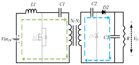 When the switch is turned on, the diode D2 gets reversed biased as shown in Figure 3. The related Kirchhoff’s voltage law (KVL) equations for the switched-on mode of operation are as follows: