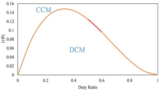 For the proposed modified isolated SEPIC converter, the normalized inductor time constant is defined by Equation (24), and the boundary time constant for continuous conduction mode (CCM) and discontinuous conduction mode (DCM) is defined by Equation (25). For continuous conduction mode , otherwise, the circuit enters the discontinuous mode of operation. The boundary conditions for CCM and DCM are shown in Figure 5, with a transformer of unity turn ratio; Equation (25) is used to draw this curve. In the case of DCM, there are three modes of operation, as shown in Figure 6.