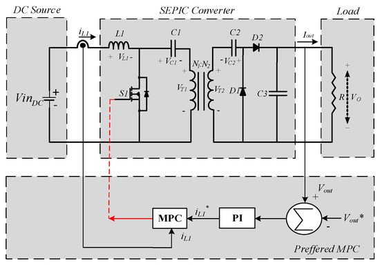 Model predictive control (MPC) is a powerful control technique that can provide superior performance, greater control, and splendid accuracy over traditional methods such as PID, sliding mode control (SMC), and feedforward control which makes it an attractive option for power electronics converter control. When compared to conventional control approaches, MPC updates the system model frequently based on data collected in real time, making it more successful at managing model uncertainties. In a proposed converter, MPC can incorporate these constraints directly into the control design and ensure that they are satisfied throughout the control process. Figure 2 shows the circuit of a proposed modified isolated DC-DC SEPIC converter. It is possible to write the differential equation as in [24] by combining Equations (2) and (9) and adding the inductor ESR R1 drop and defining a switching function S to obtain the dynamic model of the input inductor current. In the finite control set model predictive control (FCS-MPC), the controlled variable is taken as the state of an energy storing element, which in our system is the input inductor current iL1.