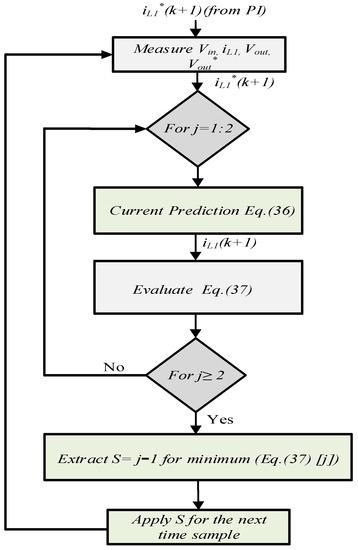 In Equation (36), is the sampling period, S stands for the switching state with 1 for the on state of power MOSFET and 0 for the off state of power MOSFET, is the inductance, and is the resistance of the inductor. The preferred MPC scheme is shown in Figure 7.