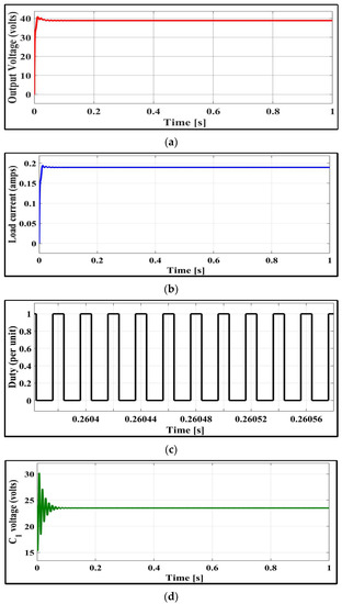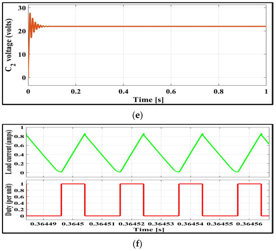 The simulation results are carried out using the MATLAB R2021b software to test the efficacy of the proposed modified isolated SEPIC converter. As illustrated in Figure 9a, the measured output voltage is determined to be 38 V at an input voltage of 24 V, with a duty ratio of 0.4. Figure 9b shows the output current of the proposed converter. The modest voltage loss is caused due to parasitic and on state resistances of the converter. Figure 9d and Figure 9e display the capacitor voltage of C1 and C2, and it is found to be 24 V and 23 V, respectively. These values are in conformity with the theoretical study. The inductor current is continuous, and the average value of is determined to be 0.8 A, as shown in Figure 9f. Figure 10a shows the simulation results of the preferred MPC against rapid RL change from 100 Ω to 200 Ω, and Figure 10b shows the simulation waveforms of the preferred MPC with input voltage variations from 24 V to 30 V. Table 3 shows the simulation design parameters of the proposed modified isolated SEPIC converter.
