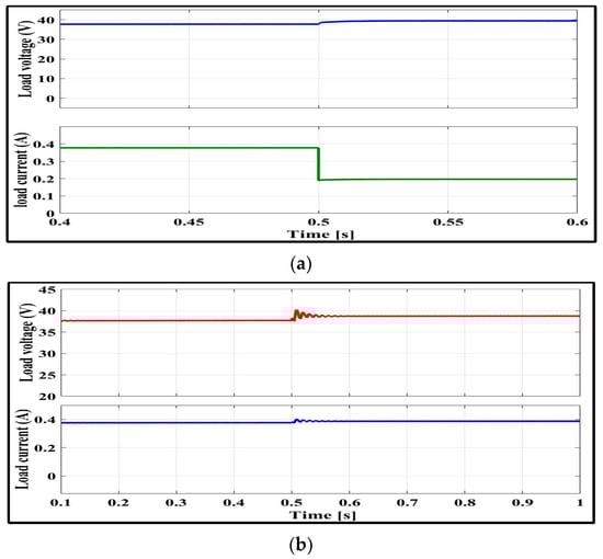 To test the MPC resistor, a divider-based voltage sensor is used to measure and calculate the amount of DC output voltage, and the (ACS-712) current sensor is used to sense the input current of the converter. The microcontroller then creates the control signal and applies it to the power MOSFET (C3M0060065K) gate driver. The hardware results of the modified isolated SEPIC converter with the MPC technique against rapid fluctuation in RL load are shown in Figure 14. The output voltage is the same as that of the reference voltage of 48 V, and this voltage is fixed and not changing even after changing the load by 50%.