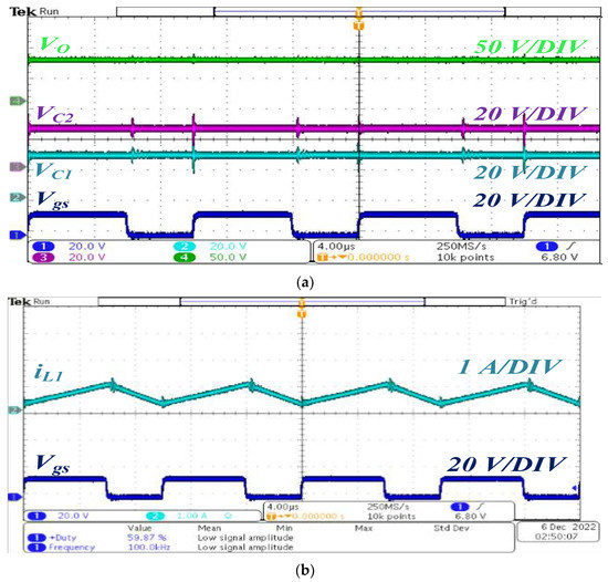 To test the hardware, a PWM pulse of a required duty ratio is generated through the microcontroller STM32 (Nucleo-H743ZI2). To test the circuit in the open loop, a PWM pulse is applied to the specified pin of the converter’s gate driver circuit, which operates at a duty ratio of 0.6, at a frequency of 100 kHz, and with a load resistance of 250 Ω. The switching frequency is set to 100 kHz so that the size of the passive components is reduced. The measured output voltage is 67 V, almost the same as the theoretically calculated value at an input voltage of 28 V with a duty ratio of 0.6, as depicted in Figure 12a. The converter is working in CCM, as depicted in Figure 12b. The magnitude of the voltage across both capacitors (C1 and C2) is 27 V; this is because of the unity turn ratio of the transformer.