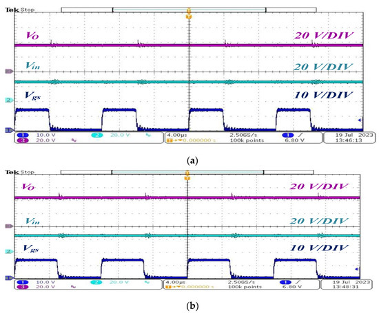 Experimental results of the proposed modified isolated SEPIC converter with a load resistance of 50 Ω: (a) Vo, Vin, and Vgs waveforms at a duty ratio of 0.4; (b) Vo, Vin, and Vgs waveforms at a duty ratio of 0.5.