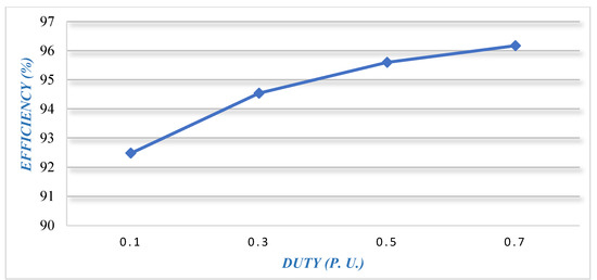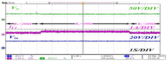 Figure 15 shows the dynamic response of Vo, Vin, and iL1 for shifting the input voltage from 20 V to 24 V and from 30 V to 24 V. The responses obtained in Figure 15a show the hardware results when the Vin is switched from 20 V to 24 V; despite a short transition period, the output voltage is regulated at its reference value of 50 V. Similarly, Figure 15b shows the hardware results when Vin is shifted from 30 V to 24 V and the converter’s operation mode is changed from buck to boost mode; the output voltage is regulated at a reference of 50 V. These results demonstrate that the preferred MPC strategy regulates Vo when the input voltage varies. The proposed modified isolated SEPIC converter has a efficiency of 92.5% to 96.3% as illustrated in Figure 16.