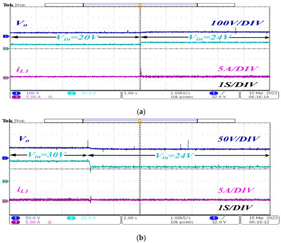 Dynamic responses captured waveforms of Vo, Vin, and iL1 of preferred MPC with (a) Input voltage variation from 20 V to 24 V; (b) Input voltage variation from 30 V to 24 V.