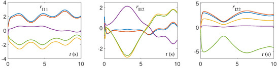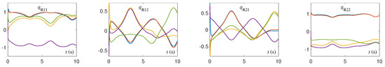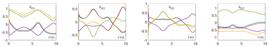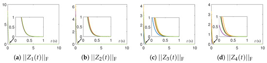 The CTQRD model (5) is implemented by using the ODE (ordinary differential equation) solver [37] in MATLAB routine. Specifically, the ODE function “ode45” is applied in this paper, and the numerical experimental results are shown in Figure 1, Figure 2, Figure 3, Figure 4, Figure 5, Figure 6, Figure 7 and Figure 8. Note that, in Figure 1, Figure 2, Figure 3, Figure 4, Figure 5, Figure 6, Figure 7 and Figure 8, the solution trajectories and residual errors corresponding to different initial values are represented in different colors. From Figure 1, Figure 2, Figure 3 and Figure 4, we can see that the solution trajectories synthesized by CTQRD model (5) with five random initial values and for Example 1 are indeed time-varying. Additionally, the solution trajectories synthesized by (5) for Examples 2 and 3 are omitted because of the space limitation and similarity. As shown in Figure 5, Figure 6 and Figure 7, the residual errors of CTQRD model (5) for Examples 1 through 3 converge to near-zero rapidly, which means Theorem 2 is correct. Meanwhile, the residual error trajectories of the original equivalence problem shown in Figure 8 verify the correctness of this theorem again.