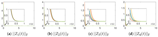 According to the description of (1) in Section 2, we know that must be an upper triangular matrix at any time in the QR decomposition process. That is to say, for any time instant , except for the elements on and above the main diagonal, all other elements of are equal to zero. In order to meet this condition, inspired by [32,34,35], we have the following theorem.