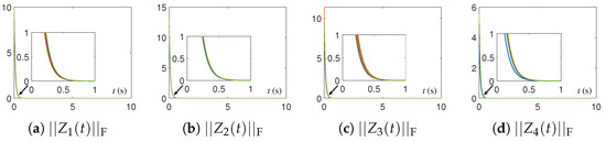 To obtain the solutions (i.e., , , , and ) of (2), according to the ZND method, four error functions (i.e., , , , and ) are defined as (3) for the first four equations in (2). Then, by using the linear design formula to zero out , , , and , (4) is derived. Apparently, when time , the solution of (4) can converge to the theoretical solution of (2) (for more convergence analysis of ZND method, please refer to [16]). Additionally, from the derivation process of (5), we know that it is exactly another expression form of (4). The proof is therefore completed. □