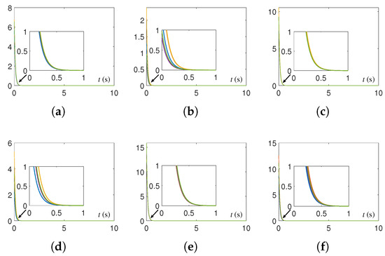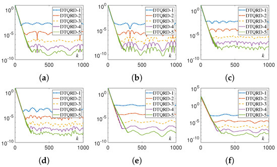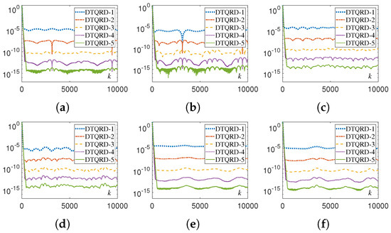 Residual errors of original equivalence problem corresponding to different DTQRD models with same random initial value, , and for Examples 1 through 3. (a) for Example 1. (b) for Example 1. (c) for Example 2. (d) for Example 2. (e) for Example 3. (f) for Example 3.
