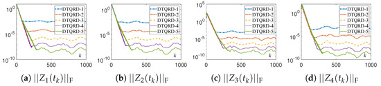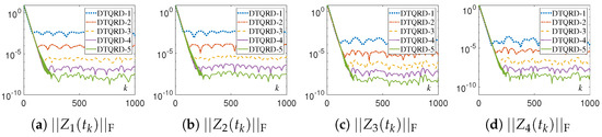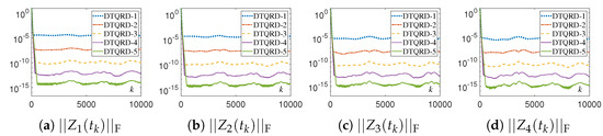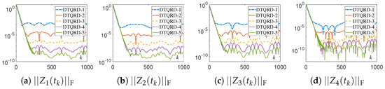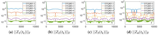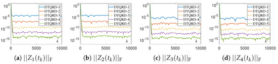 The numerical experimental results for DTQRD models are shown in Figure 9, Figure 10, Figure 11, Figure 12, Figure 13, Figure 14, Figure 15 and Figure 16 and Table 1 and Table 2. Note that, in these tables, we use the MATLAB notation form, i.e., “E” denotes “”. As seen in Figure 9, Figure 10, Figure 11, Figure 12, Figure 13 and Figure 14, the residual error trajectories synthesized by different DTQRD models change regularly, which is consistent with the conclusion of Theorem 4. From the results in Table 1, we know that the residual errors of (11)–(15) are almost proportional to , , , , and , respectively, which also verifies Theorem 4. Moreover, from Figure 15 and Figure 16 as well as Table 2, we can see that the residual errors of the original equivalence problem corresponding to (11)–(15) change in the manner of , , , , and , respectively. Thus, the correctness of Theorem 4 is substantiated.