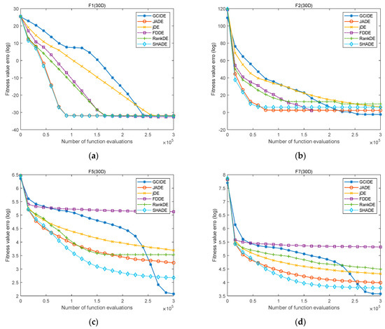Compared with classic DE, whose complexity is , GCIDE has additional computational burdens caused by three parts, including the mutation operation, the parameter control setting, and the population reduction mechanism. Herein, is the maximal number of generations. During one generation, the computation complexity of the mutation operation just includes that of calculating the value of pi, which needs to find the maximum and minimum fitness values among the current population. Thus, its extra complexity is . Meanwhile, for the parameter control setting, its only extra part is to calculate the success rate of every group based on their fitness values. Thereby, its extra complexity is . Moreover, the extra complexity of the population reduction mechanism is . As a result, the total complexity of GCIDE is , simplified as . Therefore, the new algorithm will not cause extra serious computational burden.