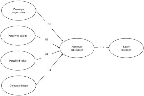 There are many reports of a corporate image having a profound positive influence on passenger satisfaction in the transport literature. The case studies by Chou and Kim [76] in Taiwan and South Korea and Kuo and Tang [77] in Taiwan on high-speed trains revealed that the corporate image has a strong positive and direct influence on passenger satisfaction. Hussain et al. [50] conducted an aviation industry case study in the United Arab Emirates (UAE) and found that corporate image has a direct and significant relationship with consumer satisfaction, value and expectations. In addition, the 2017 studies on city bus services [78] and high-speed rail [25] showed a positive, direct and significant influence of corporate image on consumer satisfaction. Fu et al. [51] recently reported similar findings for public transport in Suzhou, China. Shamsudin et al. [70] found that brand image had a significant, positive influence on ridesharing passengers’ satisfaction. The literature review on corporate image indicated that corporate image positively influences passenger satisfaction. Therefore, this paper proposes the following hypothesis.