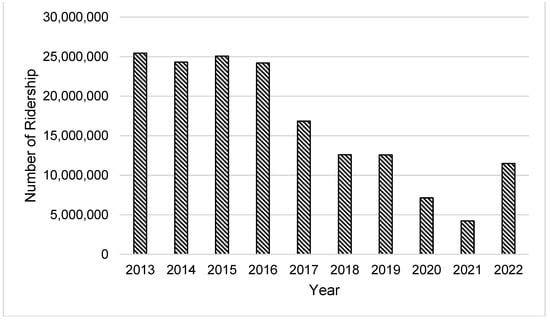 Despite the many measures governments implement to develop public transportation services rapidly, the public seems to lack interest in using such facilities. According to Van Lierop et al. [8], in many countries, the use of private vehicles is far higher than public transport usage. Masirin et al. [9] stated that the ridership of railway transit in Kuala Lumpur, Malaysia is still low. Studies in other Asian countries, such as Zulkifli et al. [10], Ibrahim et al. [11,12], and Yusoff et al. [13], yielded similar results. The annual ridership of the Kuala Lumpur monorail service declined by 54.8% from 2013 to 2022 [14]. People are more inclined to use private vehicles, such as cars, because they are faster, more reliable and better-suited for fast-paced lifestyles and provide privacy, flexibility, comfort, convenience and independence [15,16].