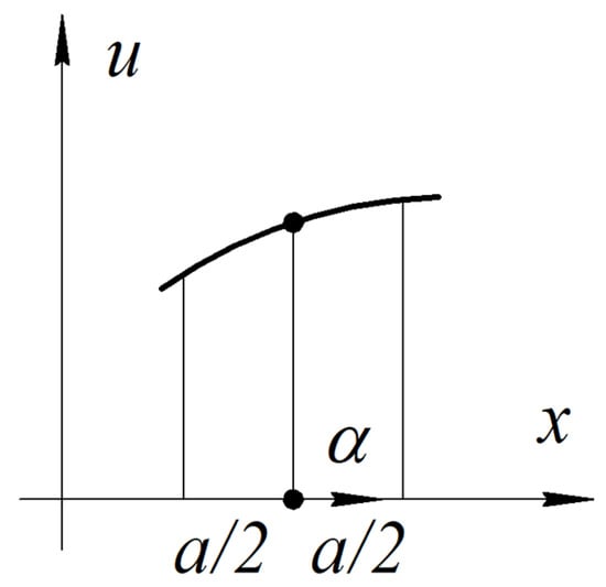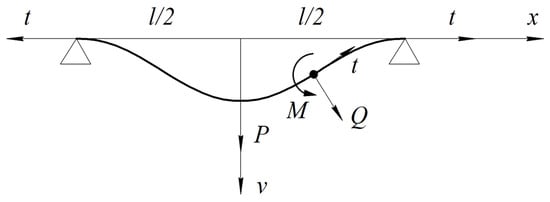 Equation (11) includes parameter , which is not known yet. To determine this parameter, we should take into account that Equation (10) describes the mathematical model of the string, which is the one-dimensional manifold. The real string is characterized with an elastic modulus and the shape and dimensions of the cross-section, which do not enter into the classical solution, Equation (10). We consider a more adequate physical model—a beam shown in Figure 5.