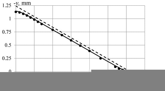 The obtained solution was verified experimentally. The experimental membrane was made of a polymeric film and had the following parameters: , , , , H. For these parameters, Equation (15) yields mm. The calculated value of the maximum deflection— is in good agreement with the experimental result—. The description of the experiment is presented in [].
