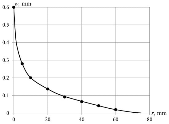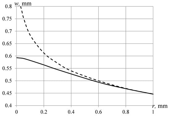 Dependence of the deflection on the radial coordinate is shown in Figure 7 with the solid line along with experimental results (dots). The line corresponds to both solutions (classical and nonlocal)—the difference between them can be seen only in the vicinity of the membrane center (Figure 8).