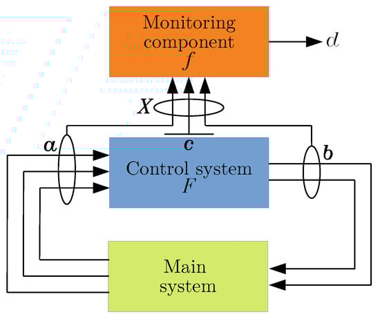 The component actively monitors the inputs of the main system (a), the control system’s response (), and, if available, the internal state variables (c) of the control system (refer to Figure 1). It is important to note that while the MC possesses the same information as the control function F, it does not perform the controlling task. The primary role of the component is to confirm the validity of its inputs . Consequently, the MC reports the operational diagnosis to a higher fault management layer with the necessary expertise to handle a fault. Although a binary diagnosis indicates the presence or absence of a fault, a more intricate output may even identify a specific fault.