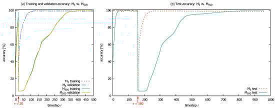 In Figure 7, we can observe the variations in accuracy over time for the models. Figure 7a illustrates the models’ performance on 500 steps of the training and validation data, while Figure 7b depicts the corresponding analysis for the test data, encompassing 960 steps. The accuracy at each time step is calculated based on 7200, 1800, and 9000 sample recordings from the training, validation, and test datasets, respectively.