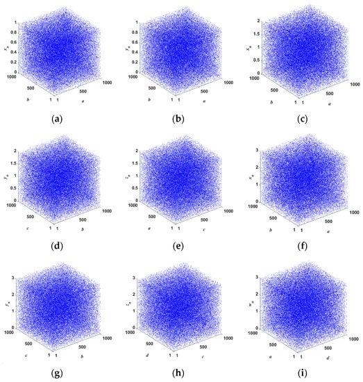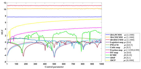 The Lyapunov exponent (LE) is an index for the quantitative evaluation of chaotic systems. It reflects the sensitivity of a chaotic system to the initial conditions and enables determination of whether the chaotic system is in a chaotic or periodic state with specific parameters. The number of Lyapunov exponents of a chaotic system is equal to the number of dimensions of its phase space. One positive Lyapunov exponent indicates that the system exhibits chaotic behavior, and more than one positive Lyapunov exponent indicates that the system exhibits hyperchaotic behavior. The spectrum of Lyapunov exponents is shown in Figure 3. All three systems have positive Lyapunov exponents equal to the dimensionality in all parameter ranges. To visualize the superiority of our proposed system, the maximum Lyapunov exponent (MLE) spectrum of the proposed systems and the seed maps are plotted in Figure 4. The MLE spectrums of chaotic systems are scaled to the figure with horizontal coordinates in the range a ∈ [1,1000]. For example, the parameter range of the logistic map is μ ∈ [μmin,μmax] = [0,4], and the value of μ as the horizontal coordinate a varies can be obtained by Equation (14). The other parameter of 2D-LPCMM was set to b = 500. The other parameters of 3D-CFICMM were set to b = 500 and c = 500. The other parameters of 4D-IISCCMM were set to b = 500, c = 500, and d = 500. The other parameter of 1DSP was set to α = 4.4926.