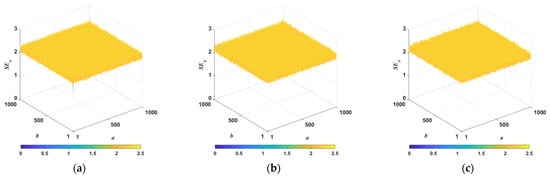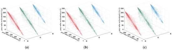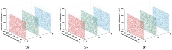 where xi and yi are two sequences of pixels of length N and yi is an adjacent pixel of xi. There is the presence of a strong correlation among adjacent pixels within a plaintext image. A smaller correlation coefficient of neighboring pixels of the ciphertext image indicates a better performance of the algorithm. Good image encryption algorithms aim to reduce the adjacent pixel correlation coefficient to close to 0. We randomly selected 10,000 pairs of adjacent pixels in the horizontal, vertical, and diagonal directions of image “4.2.05”, respectively, and plotted the correlation graph in Figure 17. In addition, Table 2 shows the specific values of the correlation coefficients for the plaintext and ciphertext images at different levels of multiple images.