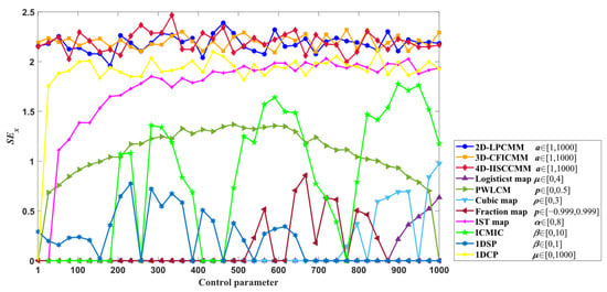 A lower SE value indicates a higher regularity in the chaotic sequence, with more certainty and order. On the contrary, higher SE values indicate higher complexity and irregularity. The parameters m and r affect the magnitude of the calculated SE, and in this paper we set them to 2 and 0.2, respectively. Figure 5 plots part of the SE of 2D-LPCMM, 3D-CFICMM, and 4D-IISCCMM, and it can be seen that in all parameter ranges SE is greater than 2. Figure 6 shows a comparison of the SE of the proposed systems and the seed maps. The other parameter settings for the multiparameter chaotic systems are the same as in Figure 4.