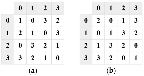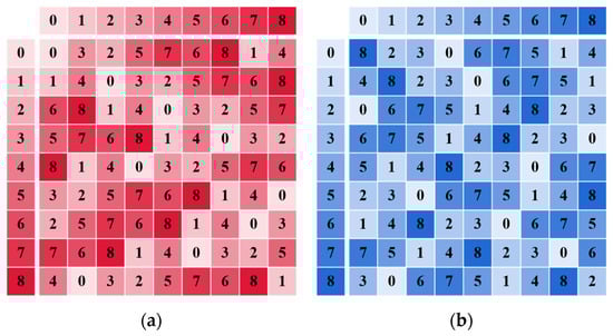 where LL is the name of the function, L[i,j] represents taking out the elements of the i-th row and j-th column of matrix L. We take an example of a lookup table based on the four-order Latin square L0 to illustrate the operation specifically, as shown in Figure 9a, where the white squares are the Latin squares L0, the gray column squares are the i in Equation (17), and the gray row squares are the j. It is easy to know that performing an addition operation on 2 and 3 yields 5 and performing a bitxor operation on 2 and 3 yields 1. However, when we perform the L0-based LL operation on 2 and 3, i.e., LL(2,3,L0), the result of the operation is the number in row 3, column 4 of L0, i.e., L0[2 + 1,3 + 1] = L0[,] = 1. In order to obtain i through k and j, we need to perform an reverse LL operation. Specifically, we obtain the reverse Latin square through Equation (18), and then we perform the LL operation on k and j. The algorithm for generating the reverse Latin square is shown in Algorithm 2, and the reverse Latin square L0′ of L0 is shown in Figure 9b.