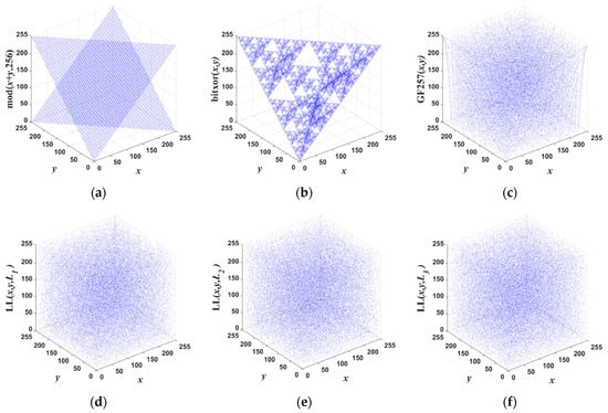 Results of different operations in the range 0 to 255: (a) modular sum, (b) bitxor, (c) GF (257), (d) LL operation based on L1, (e) LL operation based on L2, (f) LL operation based on L3.