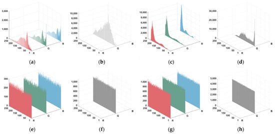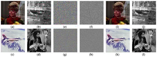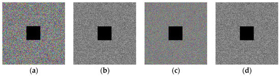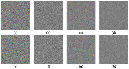 An attacker can break the encryption by choosing to encrypt a specific plaintext to obtain a plaintext–ciphertext pair. We encrypted a 512 × 512 × 3 pure black image and a pure white image, and the test results are represented in Figure 16. It can be seen that the special images are still unrecognizable as noisy images after encryption. The test data of pure black and pure white are also added in the subsequent tests.