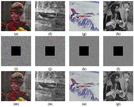 The 5% (a–d) cropped ciphertext images; (e–h) decryption images of (a–d); (i–l) 10% cropped ciphertext images; (m–p) decryption images of (i–l).