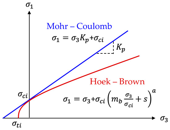 The generalized Hoek–Brown failure criterion [34] is a widely used non-linear criterion in geotechnical engineering to assess the rock mass strength and predict its failure behavior. This failure criterion considers the influence of several parameters to capture the complex behavior of rock masses. These parameters include the uniaxial compressive strength (UCS), the geological strength index (GSI), and other geotechnical parameters. The UCS is the strength of the intact rock material, and the GSI represents the quality and condition of the rock mass. This criterion is used in various geotechnical applications, including tunneling, slope stability analysis, and rock engineering design. It provides a more realistic representation of the strength and failure behavior of rock masses compared to linear failure criteria such as the Mohr–Coulomb criterion shown in Figure 4. The mathematical expression for the generalized Hoek–Brown failure criterion is as follows,