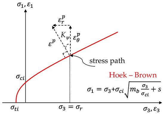 By substituting the Hoek–Brown failure criterion, Equation (19) into this Equation (25), one can obtain the relationship as follows: