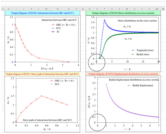- Calculation stage of stress/displacement in the plastic zone: If , it indicates that the stress state is in the plastic zone, and the plastic radius can be calculated according to Equation (27). Once this value is obtained, the program will automatically substitute Equations (29), (30), and (50) to calculate the radial stress, tangential stress, and radial displacement, respectively.