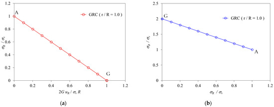 Under the isotropic stress condition, the distribution of stress/displacement on the cross-section of the tunnel caused by the excavation of the circular tunnel is investigated in this study. According to the stress distribution results of the tunnel, the following five stress states can be used to describe and verify the stress changes caused by the advancing excavation of the tunnel face: (1) When λ = 0 (), it indicates that the stresses are in the initial stress state as shown by the horizontal line on the right side in Figure 12a; (2) When 0 (), it indicates that the stress state is in the elastic region, and at this time the tangential stress and radial stress increase with the increase of the confinement loss, and the two stresses are symmetrically separated up and down along the horizontal axis (r/R); (3) When (), the plastic radius appears, and two stresses are at the elastic-plastic interface. The radial stress begins to change the curvature, and the tangential stress attains the maximum value as shown in Figure 13a, Figure 14a and Figure 15a; (4) When (), it indicates that the stresses are in the plastic region, and this leads to both the tangential stress and radial stress being decreased steeply; and (5) When (), the radial stress becomes zero and the tangential stress is equal to the coefficient proposed by the Hoek–Brown failure criterion.