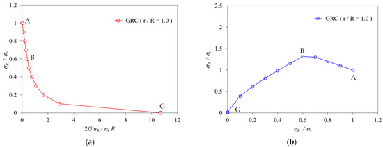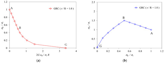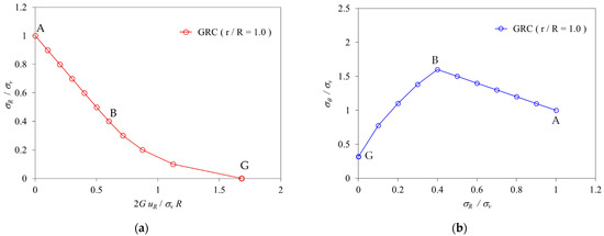 In addition, the characteristic behavior of the soft rocks (Cases II–IV) is described in Figure 9, Figure 10 and Figure 11. It indicates that the behavior of the soft rocks presents non-linear elastic-perfectly-plasticity in the ground reaction curve. The interface between the elastic region (line AB) and the plastic region (curve BC) is represented by point B. For the stress path, the Hoek-Brown failure criterion is obviously shown to have characteristic non-linearity by the curve BG in Figure 9b, Figure 10b and Figure 11b.