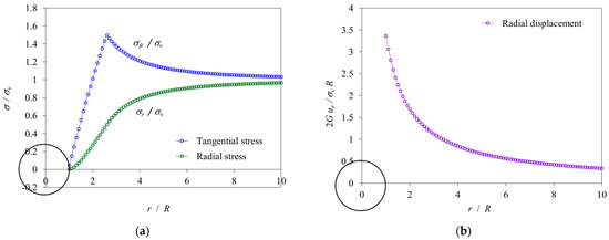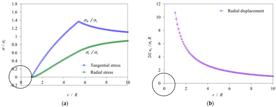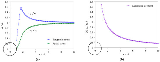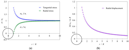 In addition, from the results obtained by Kirsch’s solution, the radial displacement (ur) in the elastic region can be given as the following: