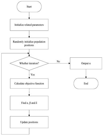 Wolves have a very strict social hierarchy, similar to a pyramid structure. GWO simulates the behaviors of gray wolves such as searching and hunting for food and determining a social hierarchy. In GWO, the first three optimal solutions are named , , and . The remaining candidates are collectively referred to as wolves , which update their positions through the positions of , , and . Wolves first determine their distances from , , and using calculations expressed in Equations (1)–(9), and positions are then updated as in Equation (10). Figure 1 is the flowchart of GWO.