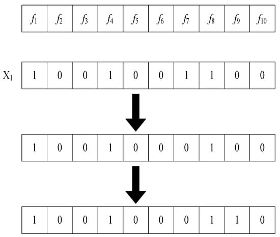 In the initial stage of GWO, wolves are far away from , , and , so is relatively large. As the optimization progresses, wolves gradually converge towards the optimal solution and becomes smaller. In binary GWO [29], the transfer function is responsible for mapping continuous space to binary space, but it ignores the impact on binary GWO. Consequently, the position of binary GWO biases towards 1 at the initial phase and 0 at the later stage. The algorithm does not produce a good balance between exploration and exploitation, so we propose an improved binary GWO, as expressed in Equation (14).