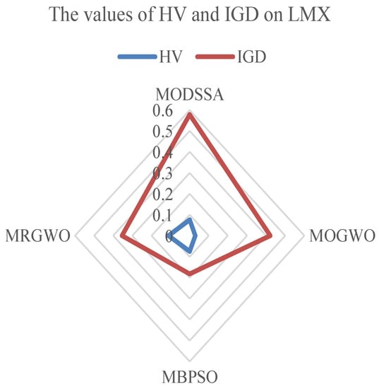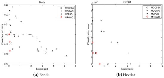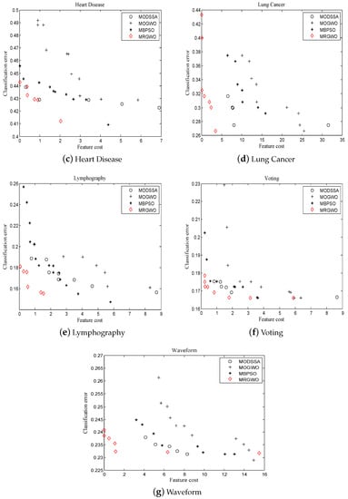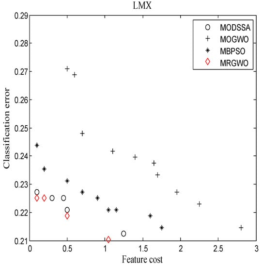 From Figure 7, it is concluded that the number of Pareto optimal solutions of MRGWO was fewer than those of MODSSA, MOGWO, and MBPSO. However, MRGWO used low feature cost and obtained low classification errors. MODSSA also acquired low cost, but the errors were higher than those of MRGWO. MOGWO and MBPSO sought to use more feature cost, yet their solutions were not as favorable as those of MRGWO. Figure 7 reveals that MRGWO is suitable for LMX and that it effectively balances feature cost and classification accuracy in multi-objective feature selection.