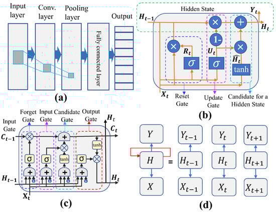 (a) The architecture of the 1-D CNN model; (b) the architecture of the GRU model; (c) the architecture of the LSTM model; (d) the architecture of the RNN model.