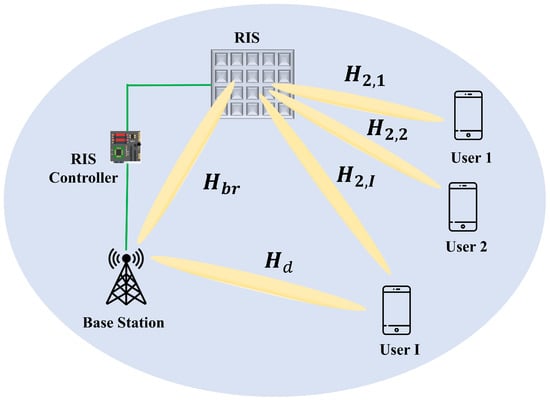 Figure 2 depicts a RIS communication system where I user equipment (UE) contains a single antenna, and the base station (BS) contains M uniform linear array (ULA) antennas. The total number of RIS is taken to be uniform planner array (UPA) N elements. For the i-th UE , the received signal through RIS can be stated as follows [6]: