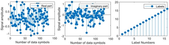 In this paper, 128 OFDM subcarriers are taken into consideration for the transmission of data, and quadrature phase shift-keying (QPSK) modulation is used to map the bits belonging to symbols. The data are transmitted over a RIS-assisted cascaded and direct channel. The BS sends the whole OFDM packet to the UE along with the additional AWGN noise. The generated feature vector and matching label are used to store the received OFDM packet as training data samples. The number of labels is created by the combination of data from BS antennas where 4 unique symbols can be generated by each antenna; in this way, labels are generated where 2 is the BS antennas number. The feature vector holds the complex signal of each symbol in the OFDM packet. To train the suggested model, the complex signal is first divided into real and imaginary components. The generated transmission and reception data are divided into training and validation data, respectively. A total of 256,000 data samples are generated where are used for training and for validation . Finally, the dataset and label samples are stored for the training and validation process. The example datasets of the real and imaginary parts of symbols with corresponding labels are shown in Figure 3.
