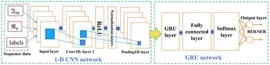 The proposed model is comprised of two different networks such as 1-D CNN and the GRU network. The proposed CNN-GRU-based network design is shown in Figure 4. The input layer, convolutional layer, pooling layer, GRU layer, and output layer make up the proposed model’s structure. The input OFDM demodulated information is extracted by the convolutional layer, and afterward, the pooling layers are used to compensate for the features. Then, the GRU layer is utilized for memorizing features of the previous 1-D CNN output. In the end, the classification is performed by the softmax layer for GRU output. The operation of each layer of the proposed model is described as follows: