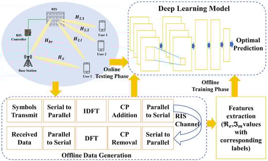 Deep learning (DL) approaches have the potential to significantly improve wireless communication performance [22,23,24,25,26]. Many works were performed in RIS-based wireless systems to handle problems related to channel state information (CSI) [27], CE [28], and performance maximization [29,30] using the DL approaches. To avoid performance loss using a DL model, in [29], the authors proposed an end-to-end training-based RIS-assisted MIMO system. The proposed system optimized the signal processing operations at the access point, RIS, and user at the same time, with active BF for the access point and user and passive BF for RIS. For estimating and identifying symbols in signals sent by RIS, the authors of [30] designed a DL method that employs fully connected layers for prediction when estimating channels and phase angles from a reflected signal received through a RIS. In [31], the authors proposed an effective RIS-assisted MIMO system based on a DNN multi-stage training strategy model for perfect CSI acquisition. The authors in [32] proposed a deep denoising neural-network-assisted compressive sensing broadband for the mmWave RIS system. An indoor RIS-based communication environment was considered in [33], where a trained DNN was used to determine the optimal phase shift by using the target user position. A deep reinforcement learning framework was proposed in [34] for predicting the RIS reflection matrix with minimal beam training overhead.