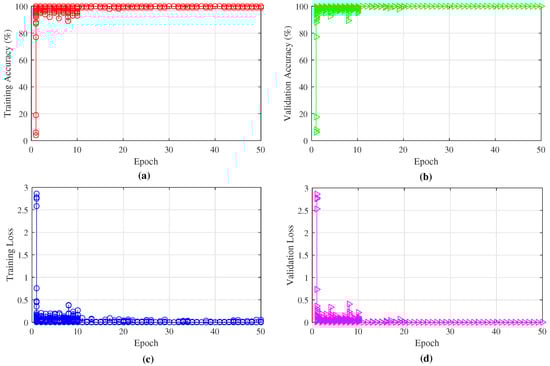 The model training performance analysis: (a) the training accuracy; (b) the validation accuracy; (c) the training loss; (d) the validation loss.