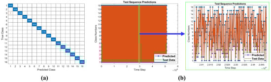 Figure 8 shows the prediction performance of the proposed CNN-GRU according to the predicated and tested data where the examined model is learned with the Adam optimizer with learning rate = at the time of training. In Figure 8a, the confusion matrix is analyzed in terms of predicted and true classes for the evaluation of prediction accuracy. There are a total of 16 classes for prediction, and it is seen that the classification error of classes is very marginal. Additionally, the performance of the test sequence prediction between predicated and tested data is shown in Figure 8b. In Figure 8b, the orange and blue color-covered regions are presented with test data and predicted data, respectively. To be more clearly visible, the zoom view of the portion of the output is indicated by the blue arrow. It is evident that the miss prediction rate of class with time step is very low and the proposed model is highly efficient.