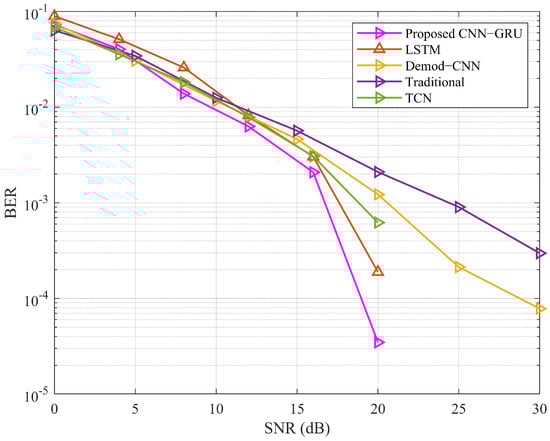 Figure 9 depicts the comparison of the proposed CNN-GRU decoding performance with the traditional method, Demod-CNN model, TCN, and LSTM model according to the BER versus different SNR values. The graph absolutely exhibits that the proposed CNN-GRU-based demodulation system outperforms the traditional method, the Demod-CNN model, TCN, and LSTM model. Due to the low SNR value at the SNR (0–5) dB range, the proposed conclusions are less precise but not less than those of the other systems. However, the model performance improves as the SNR values rise up to (5–20) dB. Evidently, the proposed model significantly outperforms other systems at SNR ranging from 0 to 20 dB and BER reaches approximately . In contrast, conventional and Demod-CNN systems cover SNR ranging from 0 to 30 dB and BER reaches around . Up to 5 dB, the BER for the proposed CNN-GRU model follows a similar pattern to all of the methods. After this threshold, the BER for the proposed CNN-GRU model significantly decreases and ends at 20 dB SNR. Additionally, the CNN-GRU is also compared with the LSTM model and TCN model. It can be shown that the suggested model performs better than the LSTM and TCN models with the SNR (0–20) dB range. Because of the low SNR values, the LSTM model performance is degraded more than all other methods, but after 12 dB SNR, its performance follows the proposed CNN-GRU model. In addition, TCN shows a little better performance with (0–3) dB SNR, and after that, the performance is degraded and follows the LSTM trends. This demonstrates how effectively the proposed CNN-GRU model can demodulate and enhance the BER system performance.
