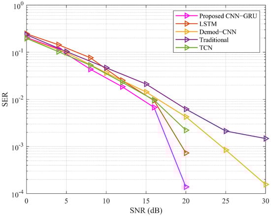 SER simulation results of CNN-GRU-based RIS-assisted MIMO communication.